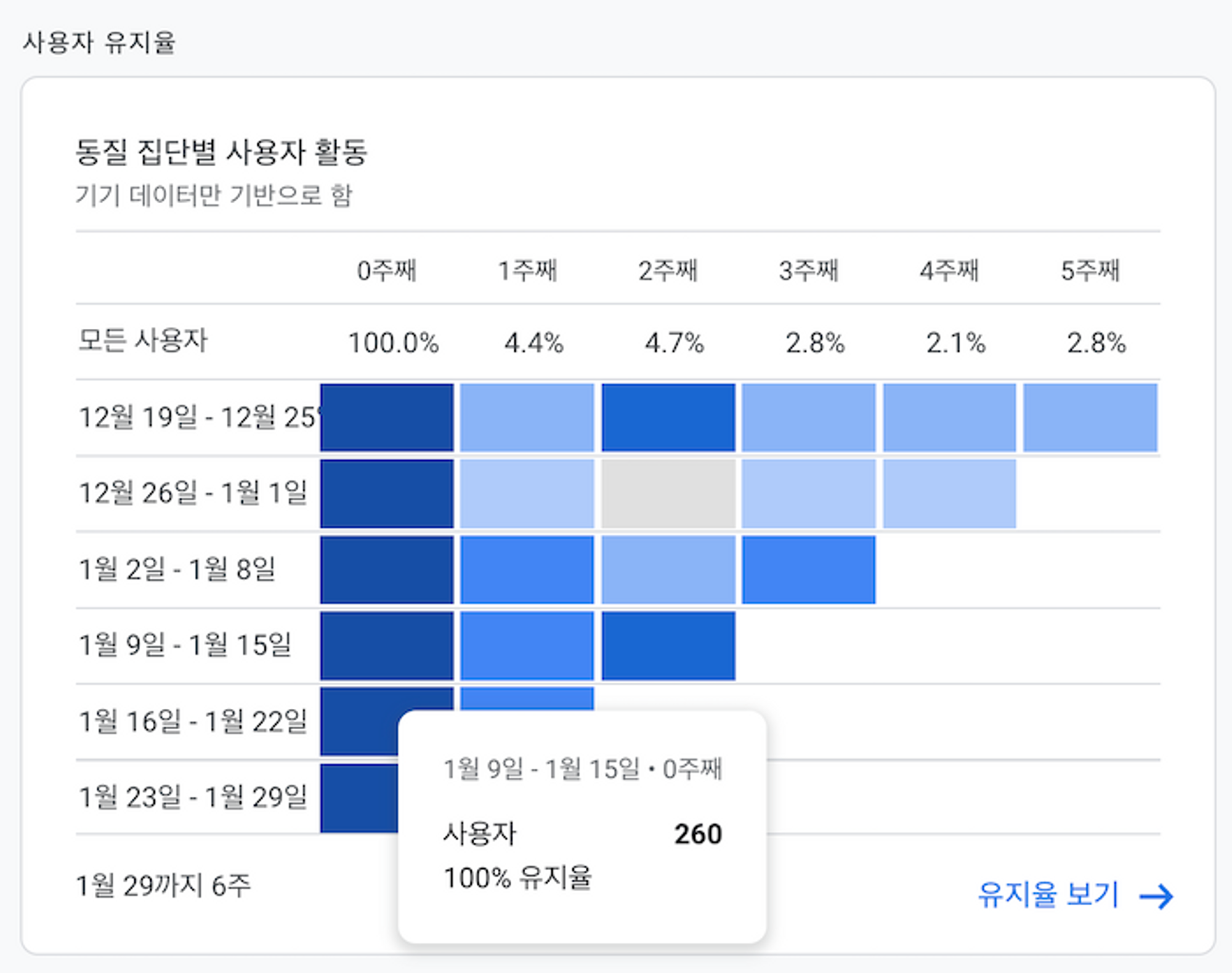- 기간 : 유지율을 구분해서 보기 위한 날짜 기준을 기록합니다. 위의 이미지에서는 0주째, 1주째로 나뉜 것을 보니 주별로 정한 것 같습니다. 사용자들의 평균 서비스 방문 주기를 고려해서 정하면 됩니다.