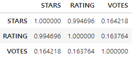 corr_columns = ['STARS','RATING','VOTES']
