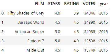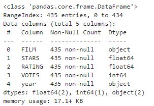 해당 작업을 해본 결과 컬럼은 FILM, STARS, RATING, VOTES가 있는 것을 확인 하였으며, 총 504개의 행이 존재한다는 것을 알 수 있었으며 4개의 컬럼에서는 NaN값이 없는 것도 확인 되었습니다.
