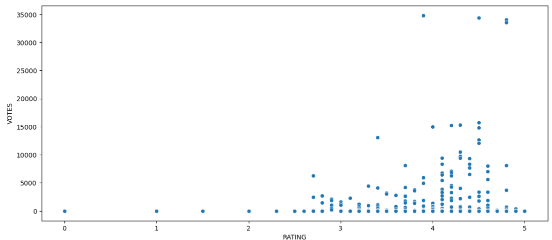 여기서 확인 되는 것은 제가 위에서 VOTES와 RATING에 대한 상관관계가 높을 줄 알았으나, 0.1점대로 매우 낮게 측정되었습니다. 그럼 제가 추측한 결과는 틀린 것으로 확인되었습니다.