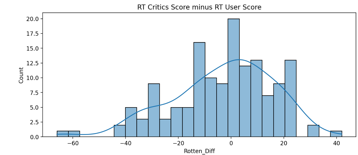 RottenTomatoes - RottenTomatoes_User로 이 차이를 계산할 것입니다. 여기서 Rotten_Diff는 비평가 점수와 사용자 점수의 차이입니다.