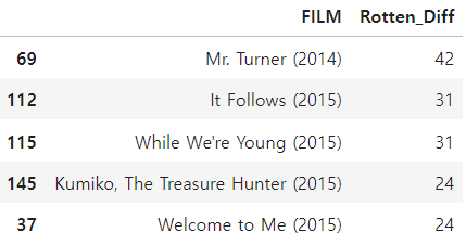 가장 큰 차이를 초래하는 영화들을 알아봅시다. 먼저, 사용자와 RT 비평가 간의 가장 큰 음수 차이를 보이는 상위 5개 영화를 출력해보겠습니다.