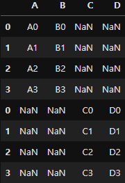 - axis = 0 : 행(row)을 기준으로 합친다는 의미이다. (두개의 data frame에서 행이 같은 인덱스라면 그 인덱스를 기준으로 합쳐지게 된다. )
